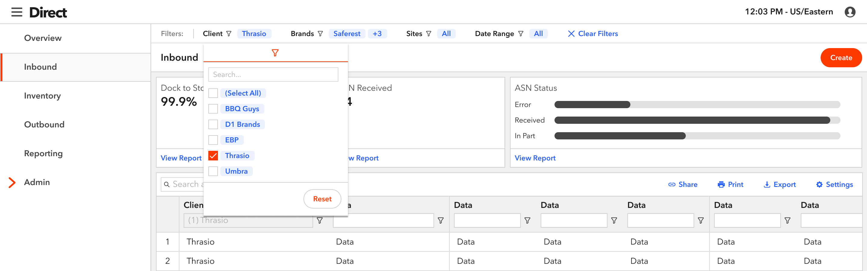 At the request of users and stakeholders, I designed a persistent filter bar that allows users of GXO’s eFulfillment web app, Direct, to filter the entire application by client-specific information. I created this feature to give our primary and secondary personas a view of their KPIs, inventory, and orders at a warehouse and brand level that they’ve never had before.